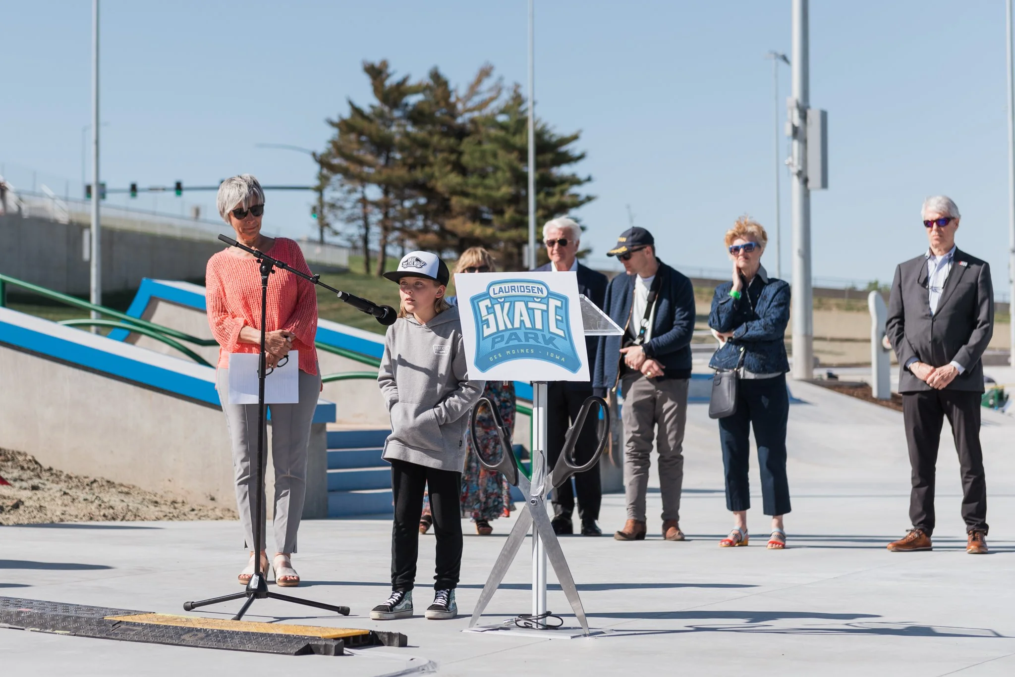 I closely followed updates from Skate DSM throughout the winter and signed both kids up for the skate clinics they were promoting in the spring. Luca was even invited to speak at the ribbon cutting ceremony right before the official opening of the skatepark. I was beyond impressed that, at only 8 years old, she spoke in front of a large crowd of strangers, reporters and news cameras, telling everyone she was most excited about the Lauridsen Skatepark because she “will never get bored here.” It's definitely a big step up from the small skatepark where she learned to skate.